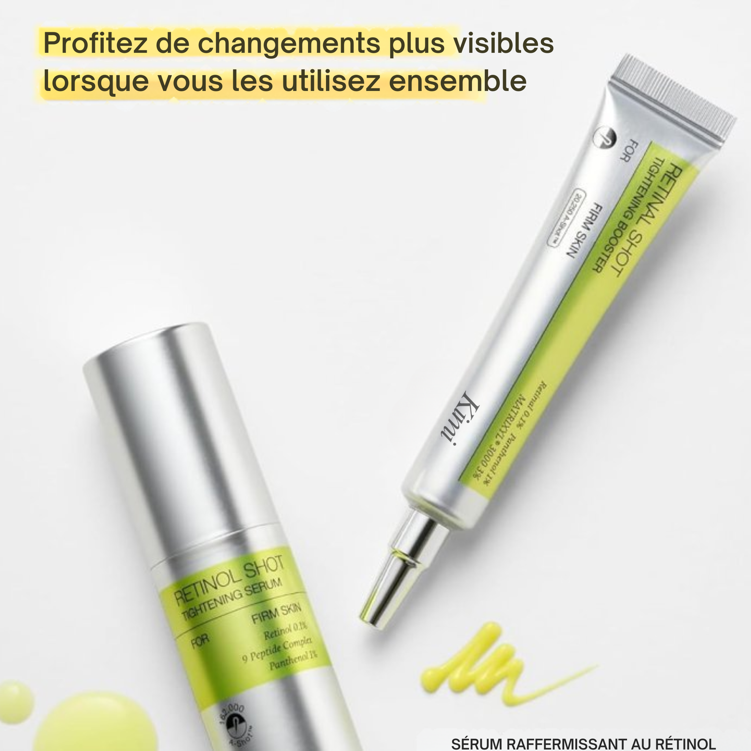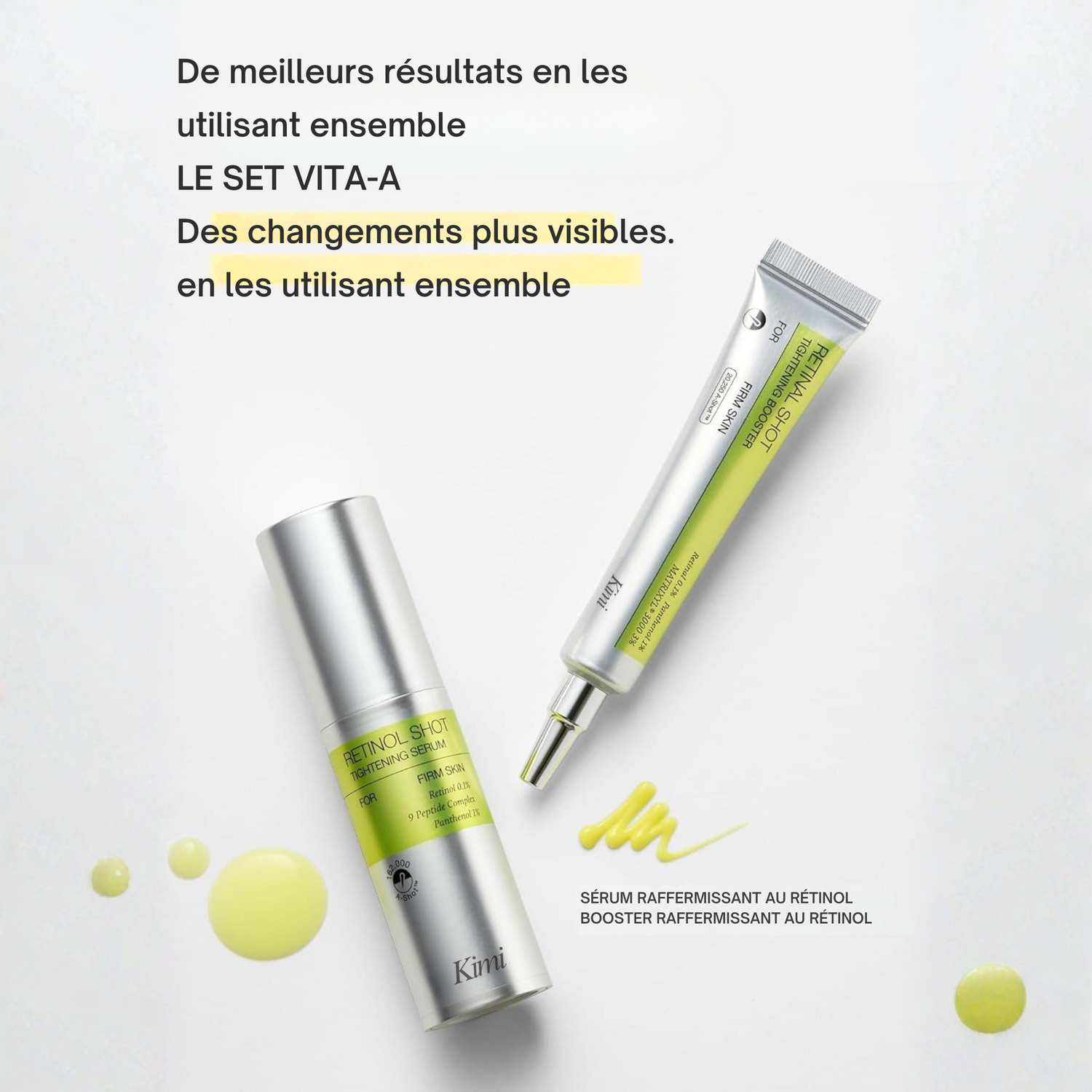 Kimi Retinol Shot™ est un booster au rétinol pensé pour améliorer visiblement l’aspect de la peau, avec une action progressive : grain de peau affiné, texture plus lisse, et peau au rendu plus uniforme.